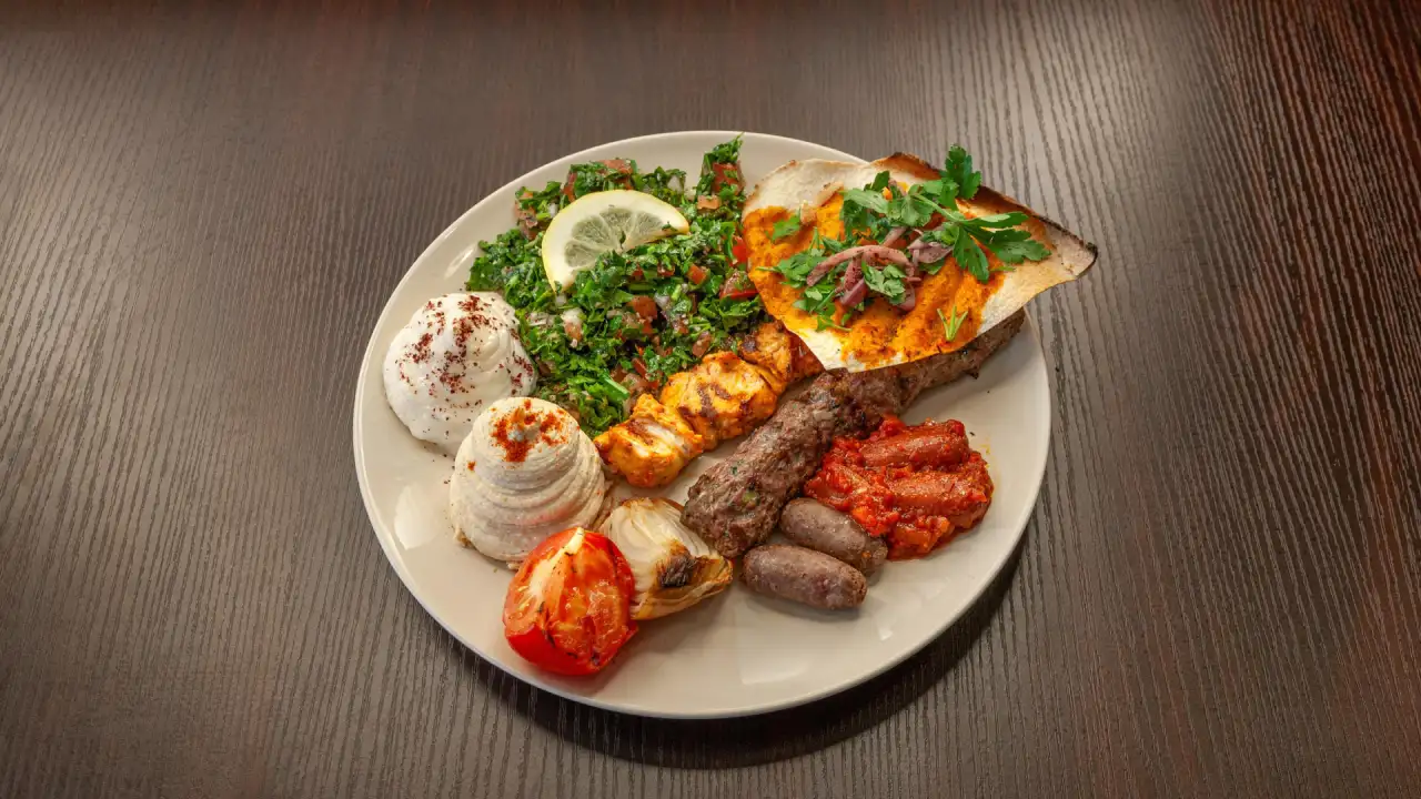 1 brochette taouk, 1 brochette kafta, 2 makanek, 2 soujouk, houmous, batata harra, taboulé.
