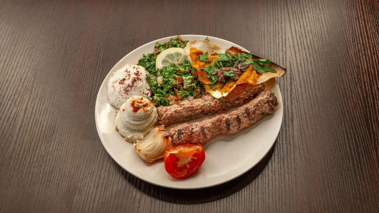 2 brochettes de kafta, accompagnées de houmous, batata harra et taboulé.