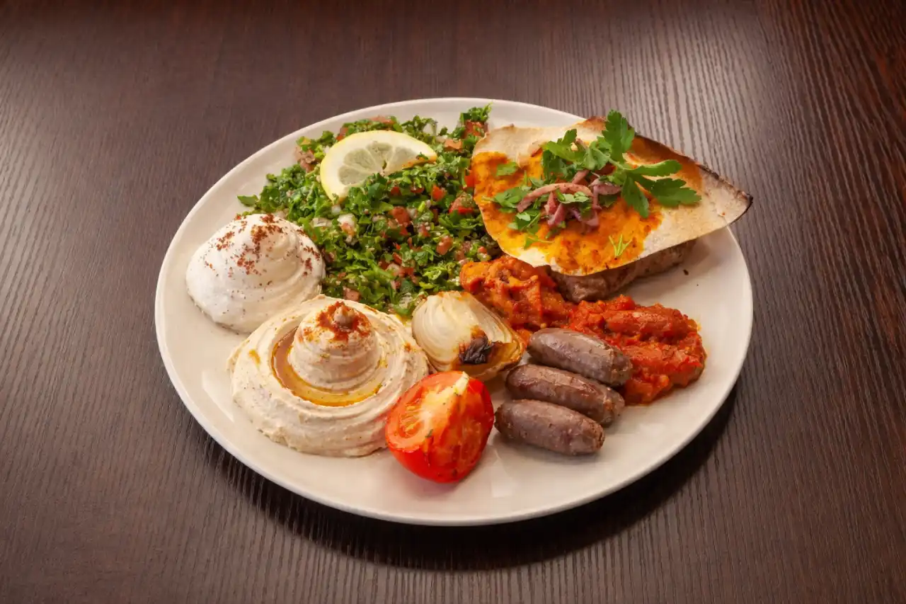 Votre choix de saucisse makanek ou soujouk avec du houmous, taboulé, batata harra.