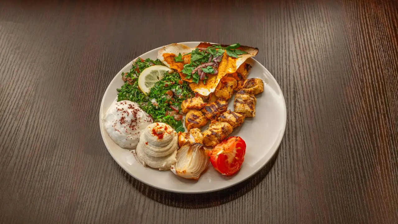 2 brochettes de blanc de poulet marinées, servies avec crème à l’ail, batata harra, houmous et taboulé.