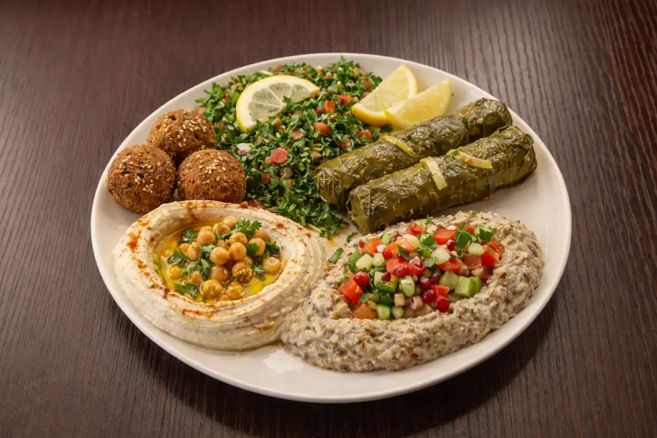 Falafel, houmous, moutabal, taboulé, feuille de vigne.