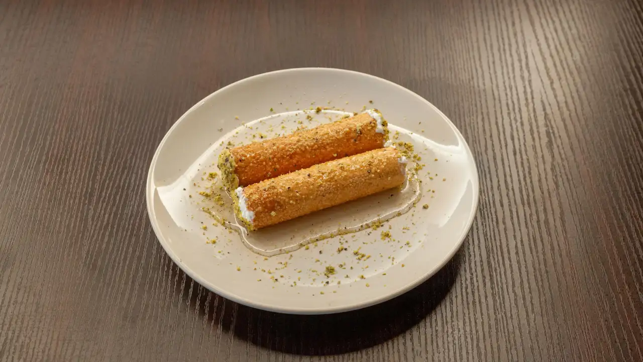 Délicieux cannoli frits, farcis d’une crème achta onctueuse et parfumée à la pistache, trempés dans un sirop de sucre pour une touche sucrée et exquise.
