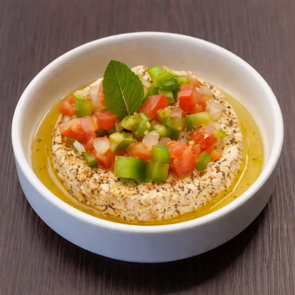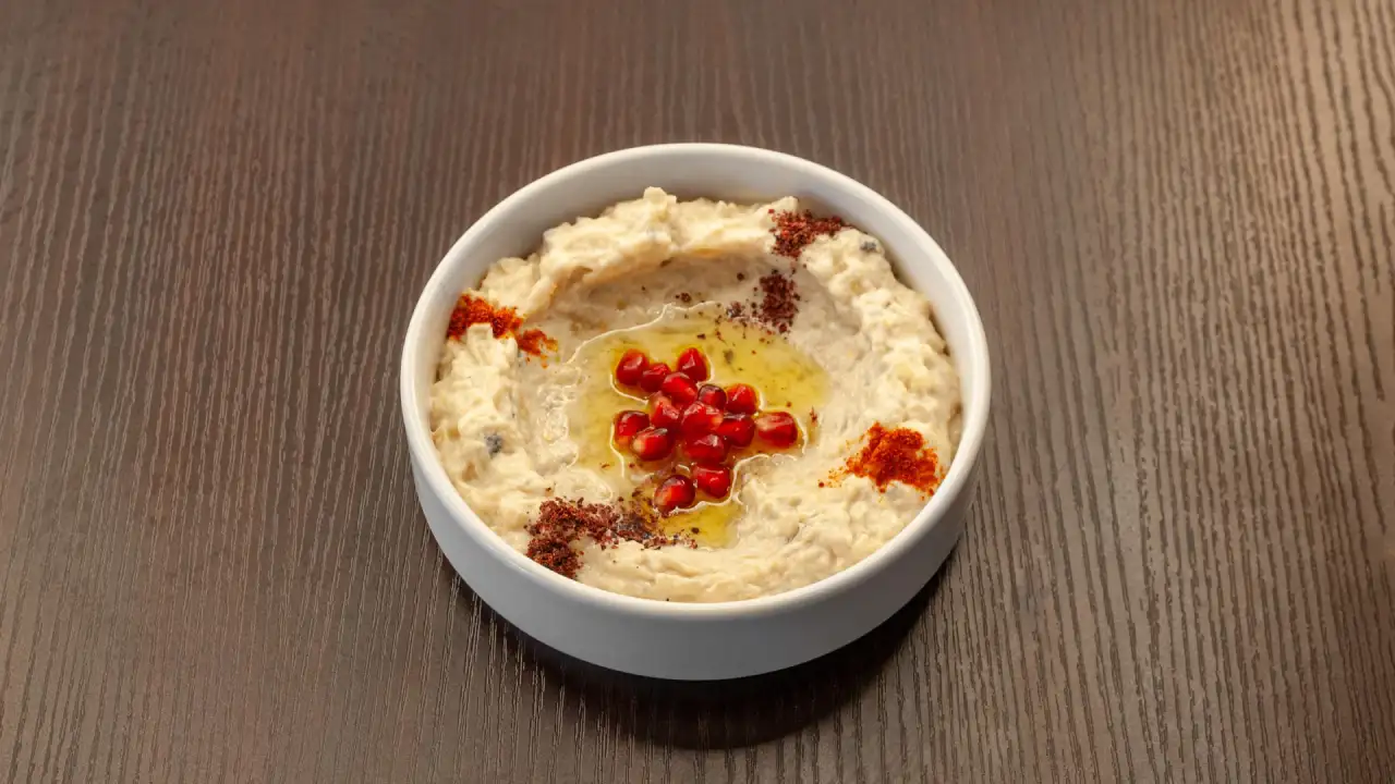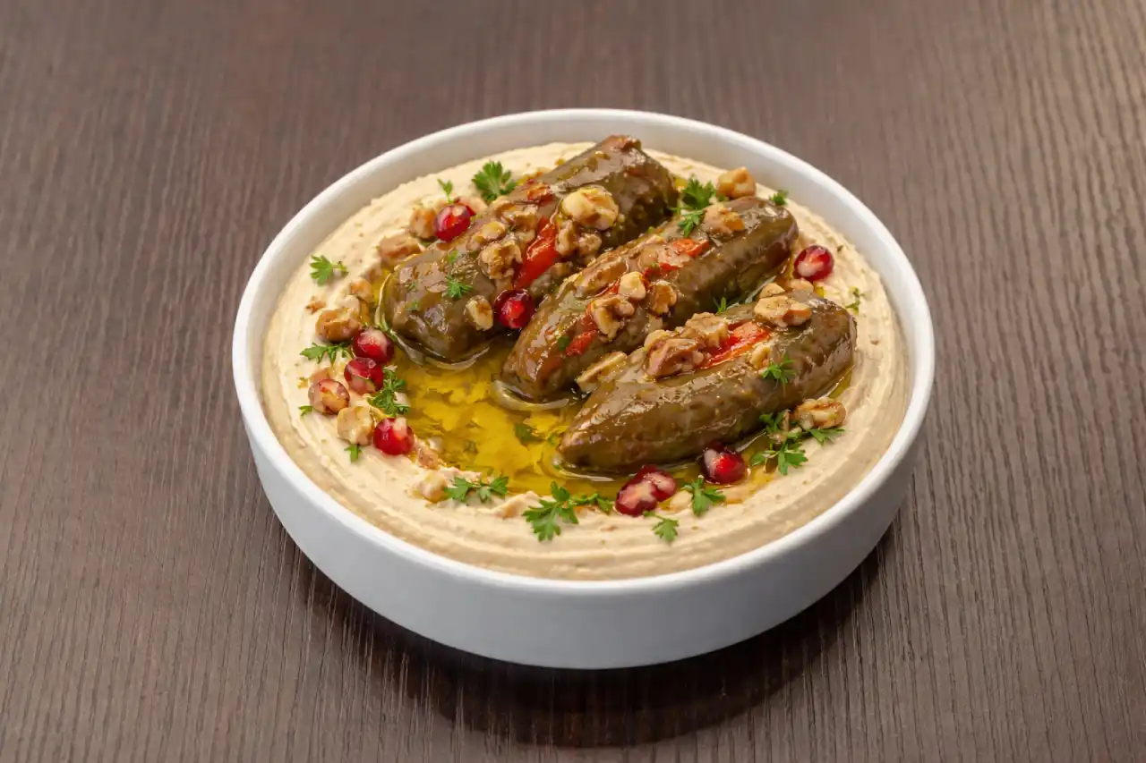 Houmous crémeux garni de makdous (aubergines farcies marinées), un mélange de saveurs