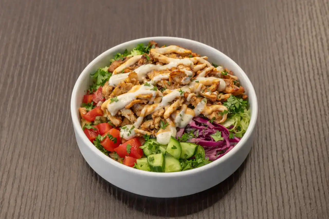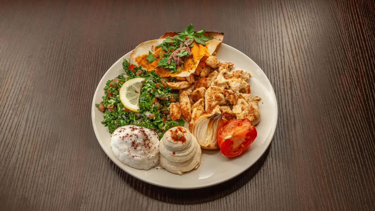 Chawarma poulet, houmous, batata harra, taboulé, crème à l’ail.