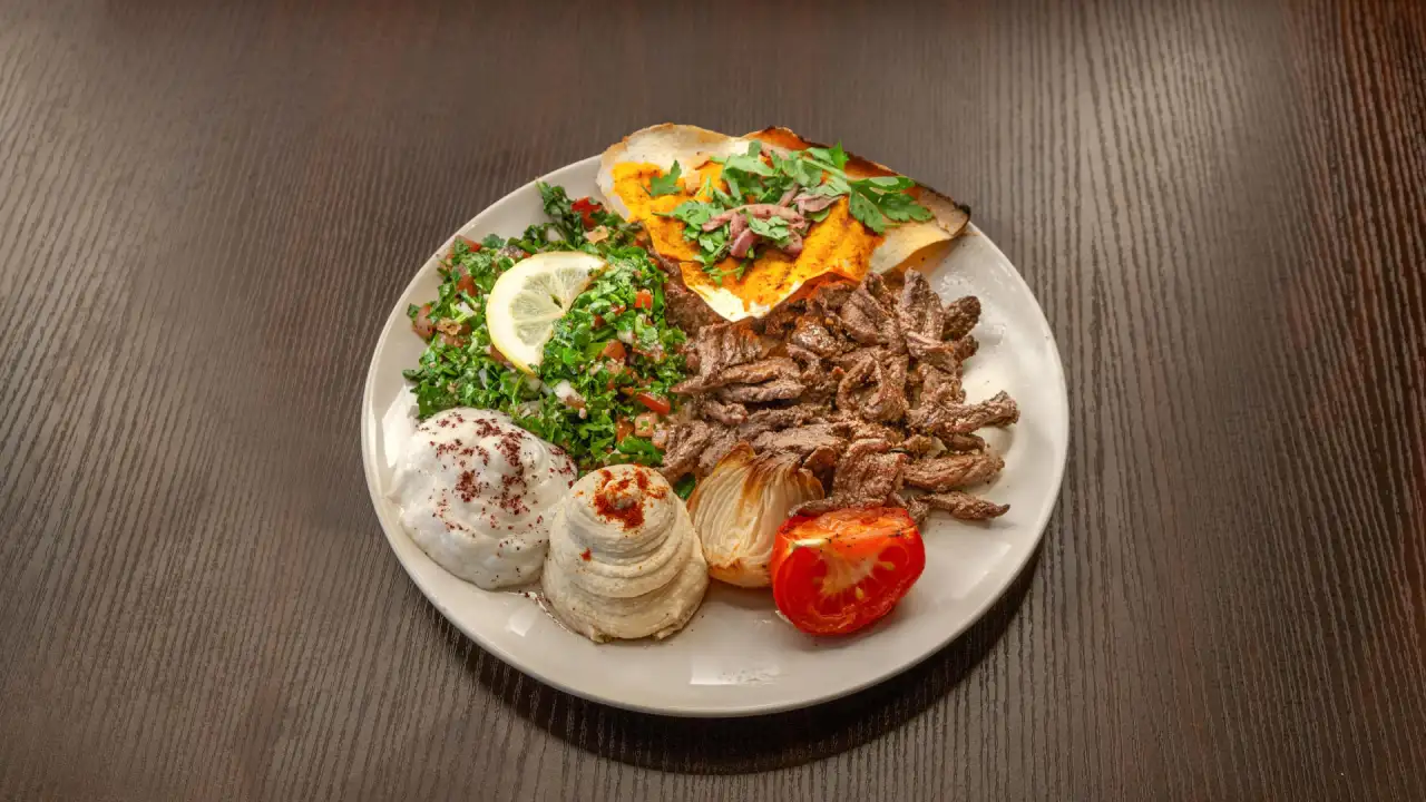 Chawarma viande, houmous, batata harra, taboulé.