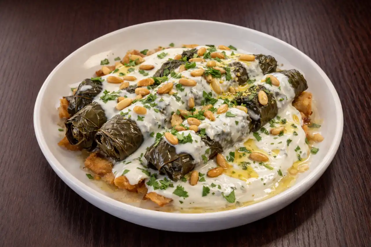 Feuilles de vigne sur lit de pain frit, nappées de yaourt à l’ail et d’un filet d’huile d’olive