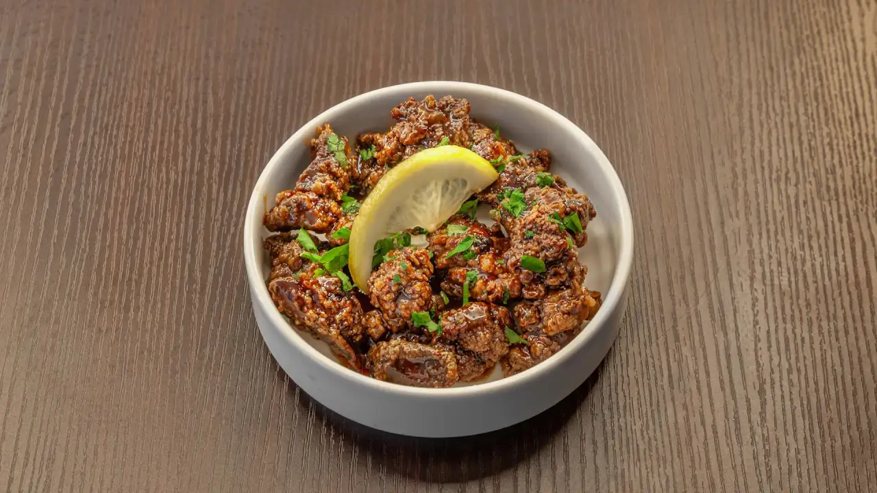 Morceaux de foie croustillants, enrobés de mélasse de grenade sucrée et acidulée