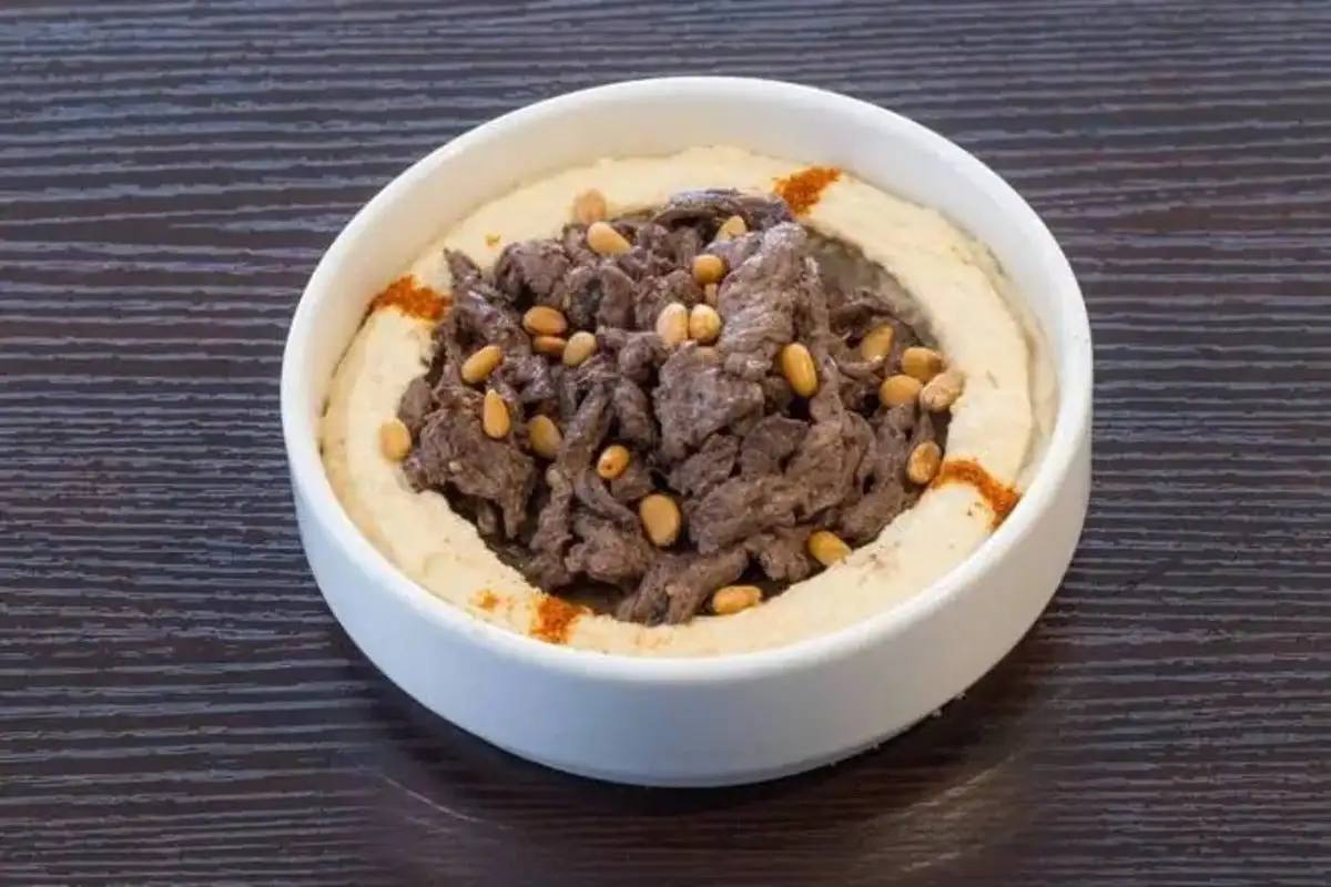 Purée de pois chiches crémeuse, lamelles de viande marinée, une explosion de saveur