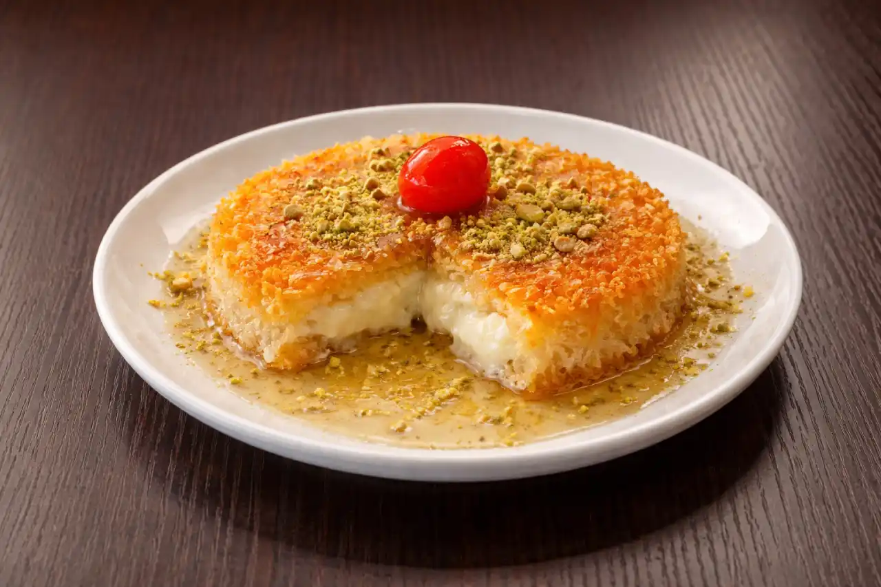 Délicieuse pâtisserie libanaise à base de semoule fine dorée, garnie d’un cœur fondant de fromage doux et nappée d’un sirop parfumé à la fleur d’oranger.