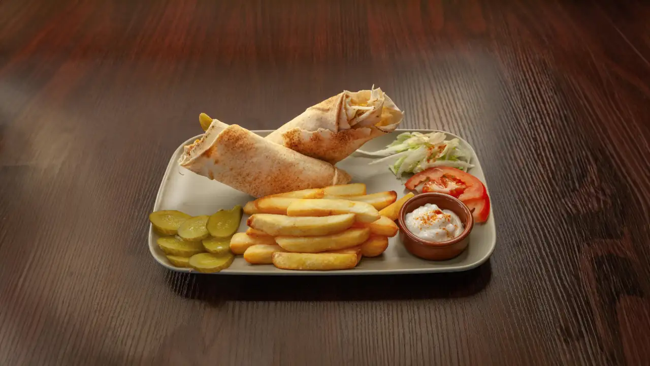 Poulet chawarma grillé dans un pain croustillant, accompagné de houmous, sauce à l’ail et frites.