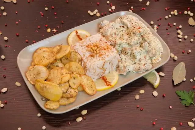 Tendres morceaux de poulet marinés dans une onctueuse sauce à la crème infusée au basilic, accompagnés de riz à l’orientale parfumé aux épices, et de pommes de terre croustillantes, sautées aux herbes.