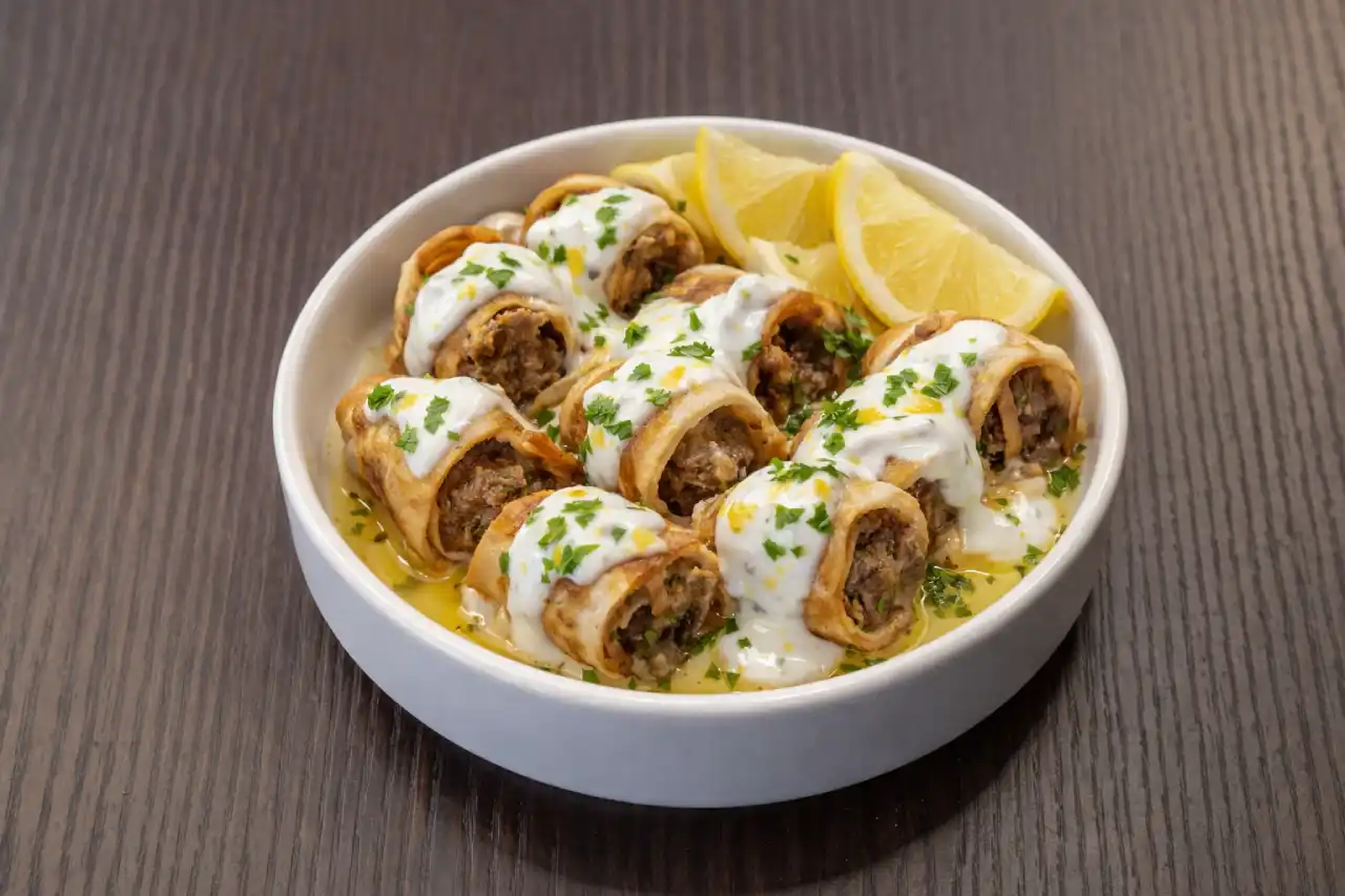 Rouleaux de kebab enroulés, garnis de yaourt citronné frais pour une touche légère et acidulée