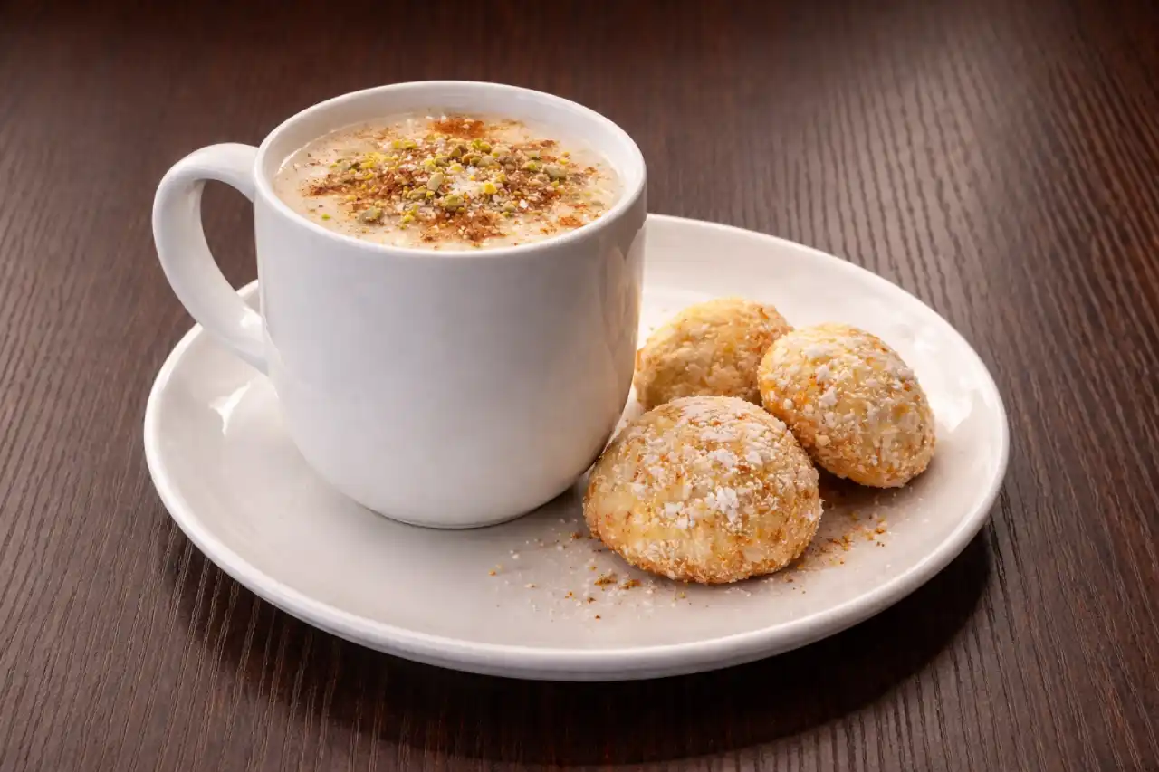 Boisson chaude et onctueuse à base de lait parfumé à la fleur d’oranger et à la cannelle, servie avec du kokos libanais pour une touche gourmande.